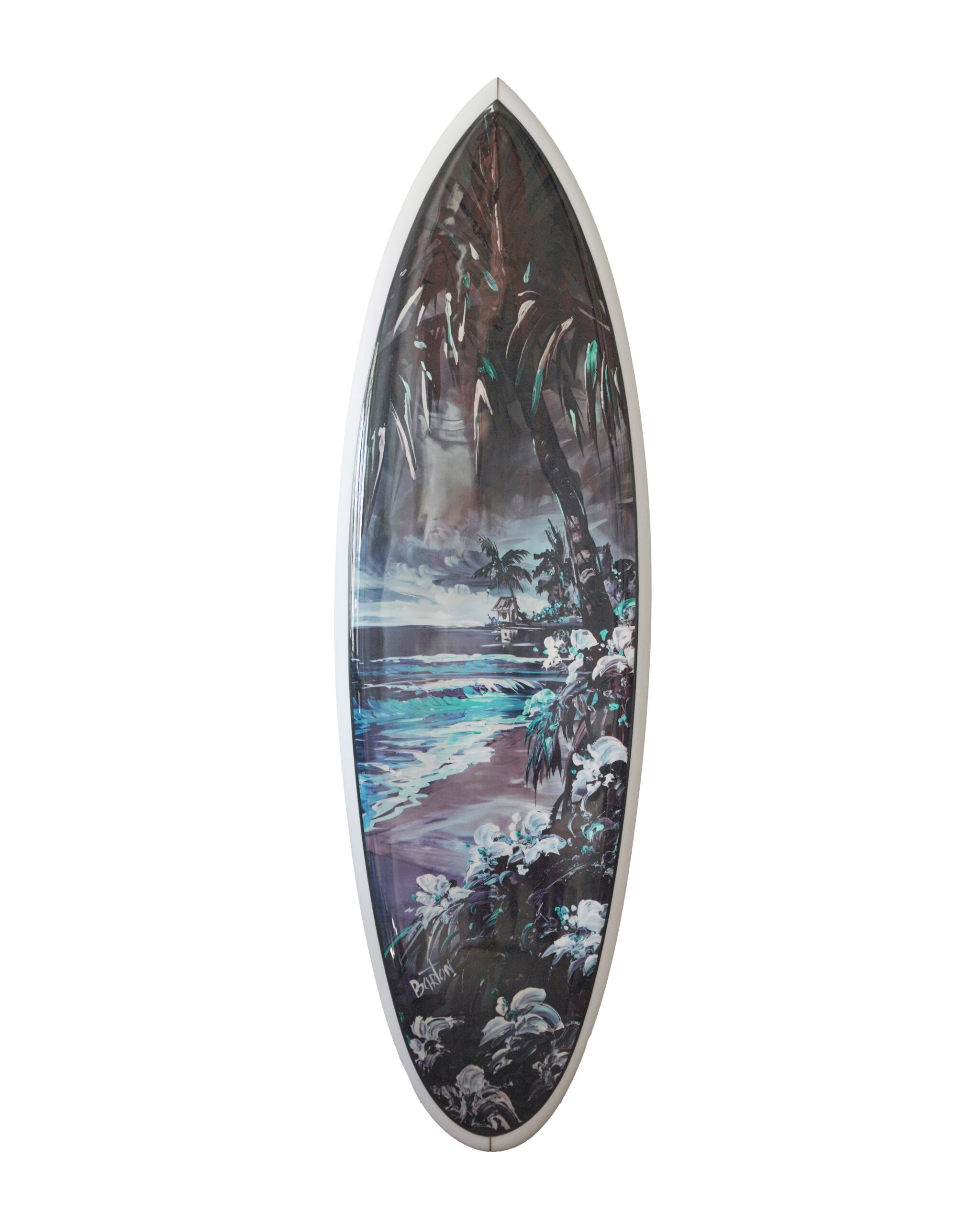 Steve Barton’s latest limited edition surfboards, a result of his collaboration with local surfboard shaper Denny Barrett, are a harmonious blend. These surfboards showcase a remarkable fusion of Barton’s artistic vision and Barrett’s expert craftsmanship, resulting in stunning pieces that transcend the realm of traditional surfboards. The marriage of artistic expression and functional design is evident in every curve, color, and detail, making these surfboards a true works of art.