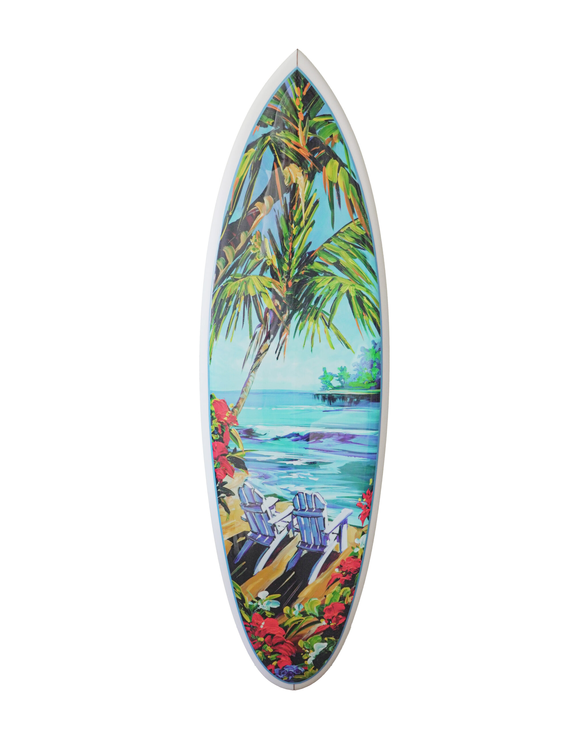 Steve Barton’s latest limited edition surfboards, a result of his collaboration with local surfboard shaper Denny Barrett, are a harmonious blend. These surfboards showcase a remarkable fusion of Barton’s artistic vision and Barrett’s expert craftsmanship, resulting in stunning pieces that transcend the realm of traditional surfboards. The marriage of artistic expression and functional design is evident in every curve, color, and detail, making these surfboards a true works of art.